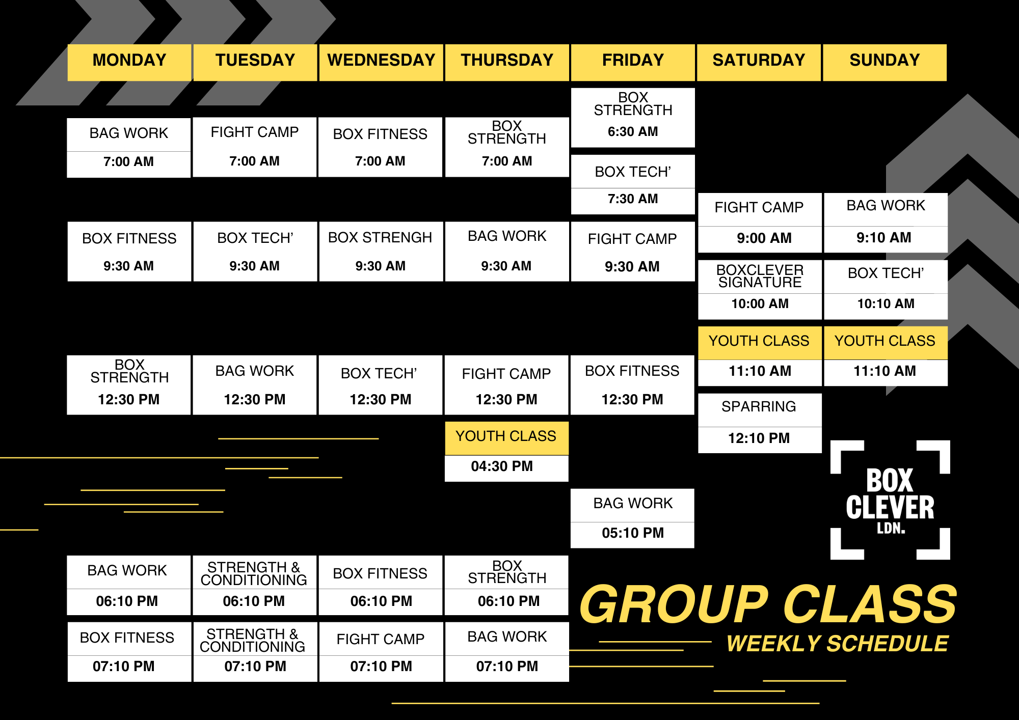 Start off your Saturday in style with our BOXCLEVER SIGNATURE training session. This class will push you to the limits for one hour, coming technical work, bag drills and a range of full body, high-intensity exercises to leave you feeling like a champion!